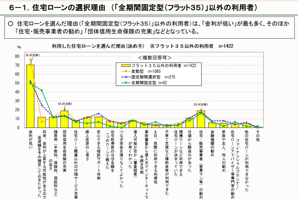 フラット35で知られる住宅金融支援機構による、2020年以降の住宅ローン利用者アンケートでは、変動金利型での利用者が72.3%とここ3年の間に全体の12%も増えているのが現状です。また、変動型を選ぶ理由についても見ていくと、日本の低金利が長く維持されてきていることにより、”返済の安定よりも”安さ”を選択する”という人が圧倒的に多いことが分かります。