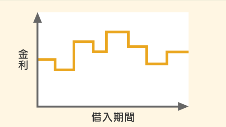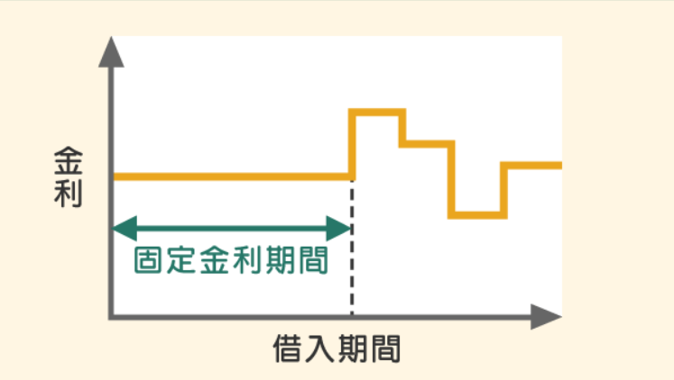 借り入れ時から2年,3年,5年,10年,15年等の一定期間中の金利を固定しその後改めて変動/固定金利の選択をするタイプ。