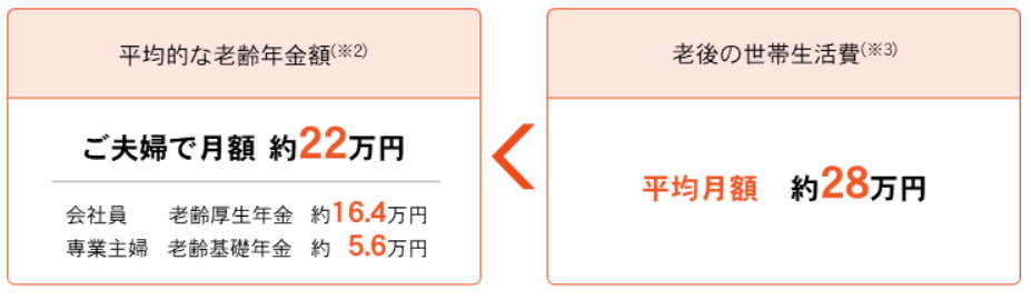 ちなみに、老後に必要な生活費で考えた場合、平均的な老齢年金額は夫婦で月額約22万円。