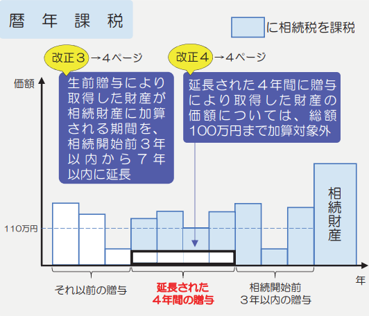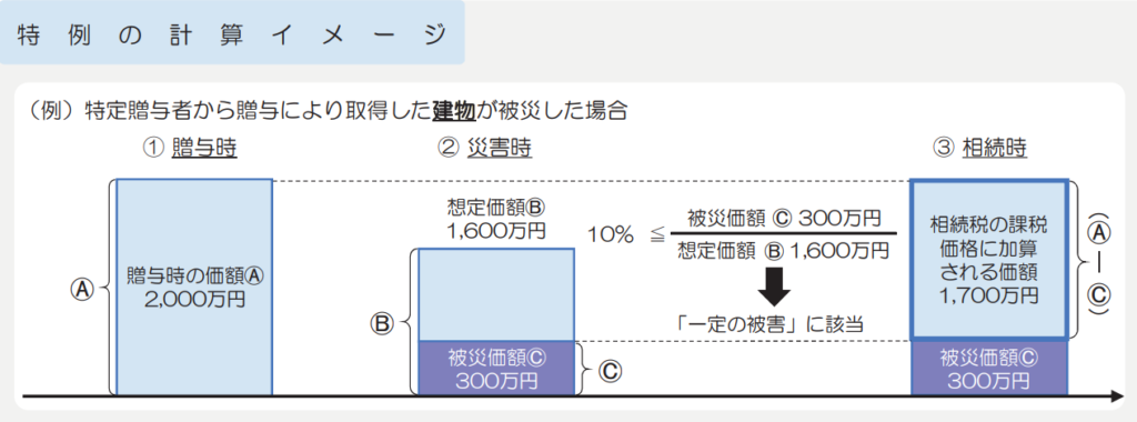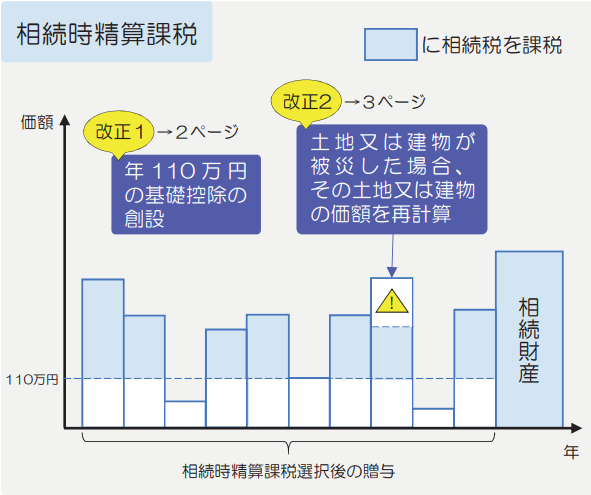| 贈与者が亡くなった場合 | 贈与時の価格で相続財産に加算する 災害等により想定価額のうちの10%以上の被災価格の被害を受けた場合、贈与時における価額から被災価額を控除した残額を相続税の課税加算に | 相続開始3年前までの贈与は相続財産に加算 (3年→7年に変更/その間4年は総額100万円まで相続税未課税) |