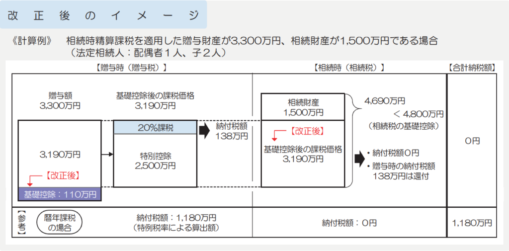 また、相続税についてもその特定贈与者から令和6年1月1日以後に贈与で取得した財産の価額は、基礎控除額を控除した後の残額とされます。
